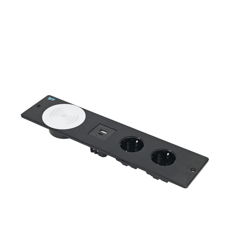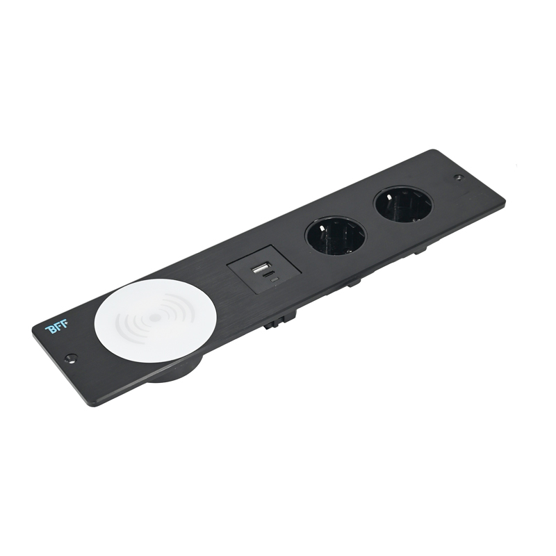 该插座配置4个功能接口:2个德式电源插+1USB A型+1USB C型+1无线充