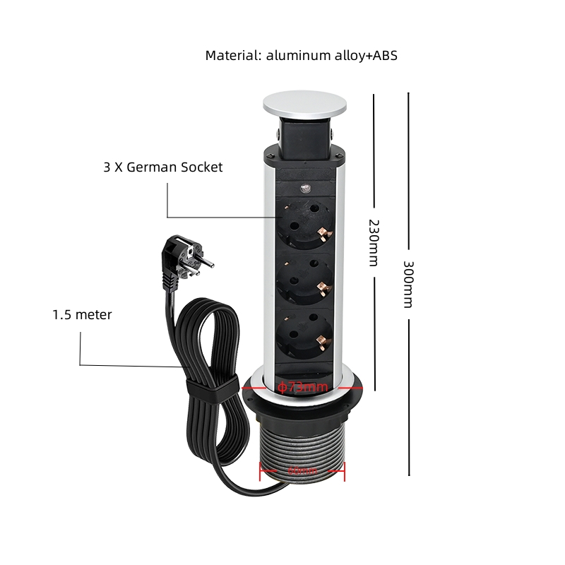 手动拉出插座配备3种功能插座类型:3X德式电源插座,在可伸缩的顶部外壳中提供电源插座,外壳受压后,精密机构自动推进带有插座的面板