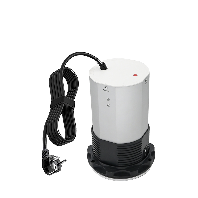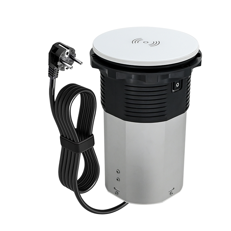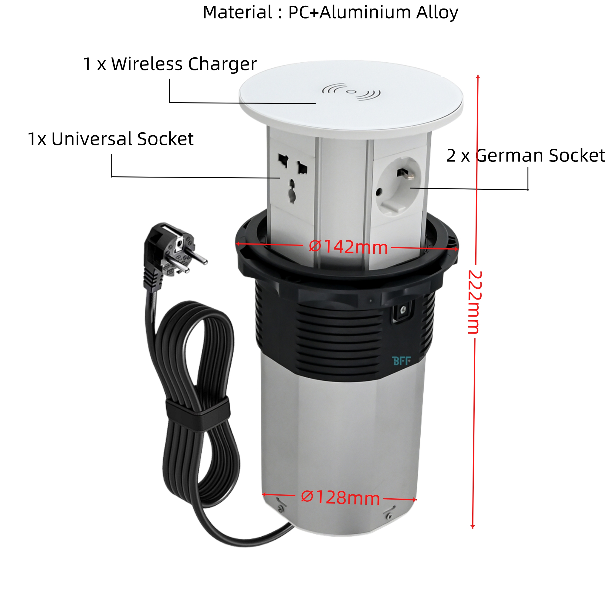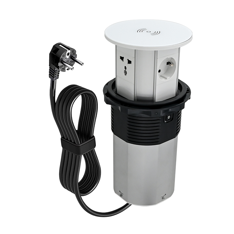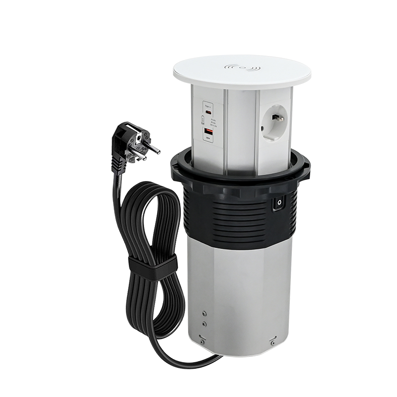手动拉出插座配备4种功能插座类型:2德式电源插座+1通能电源插座+1USB A型+ 1USB C型+1无线充,在可伸缩的顶部外壳中提供电源插座,外壳受压后,精密机构自动推进带有插座的面板