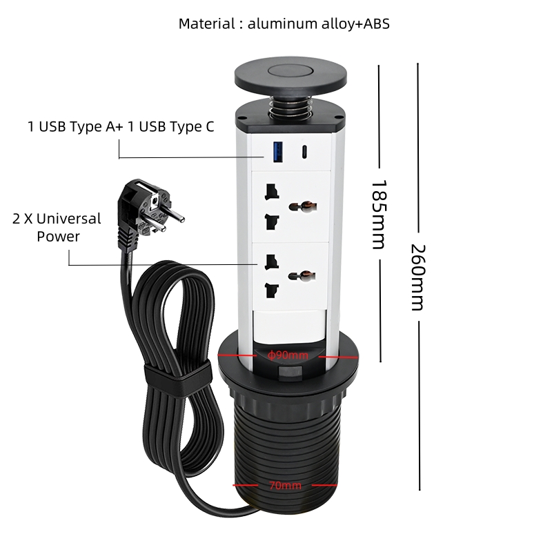 Manual pulling hidden socket has been equipped with 4 functional sockets type: 2XUK Socket+1 USB Type A+ 1 USB Type C+1Power switch in the retractable top housing provides access to electrical outlets, after the casing is pressed, the precise mechanism advances the panel with sockets automatically