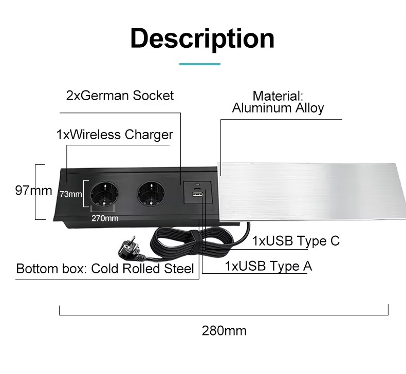 This socket has been equipped with 3 functional sockets type: 2XGerman socket+1USB Type A +1USB Type C