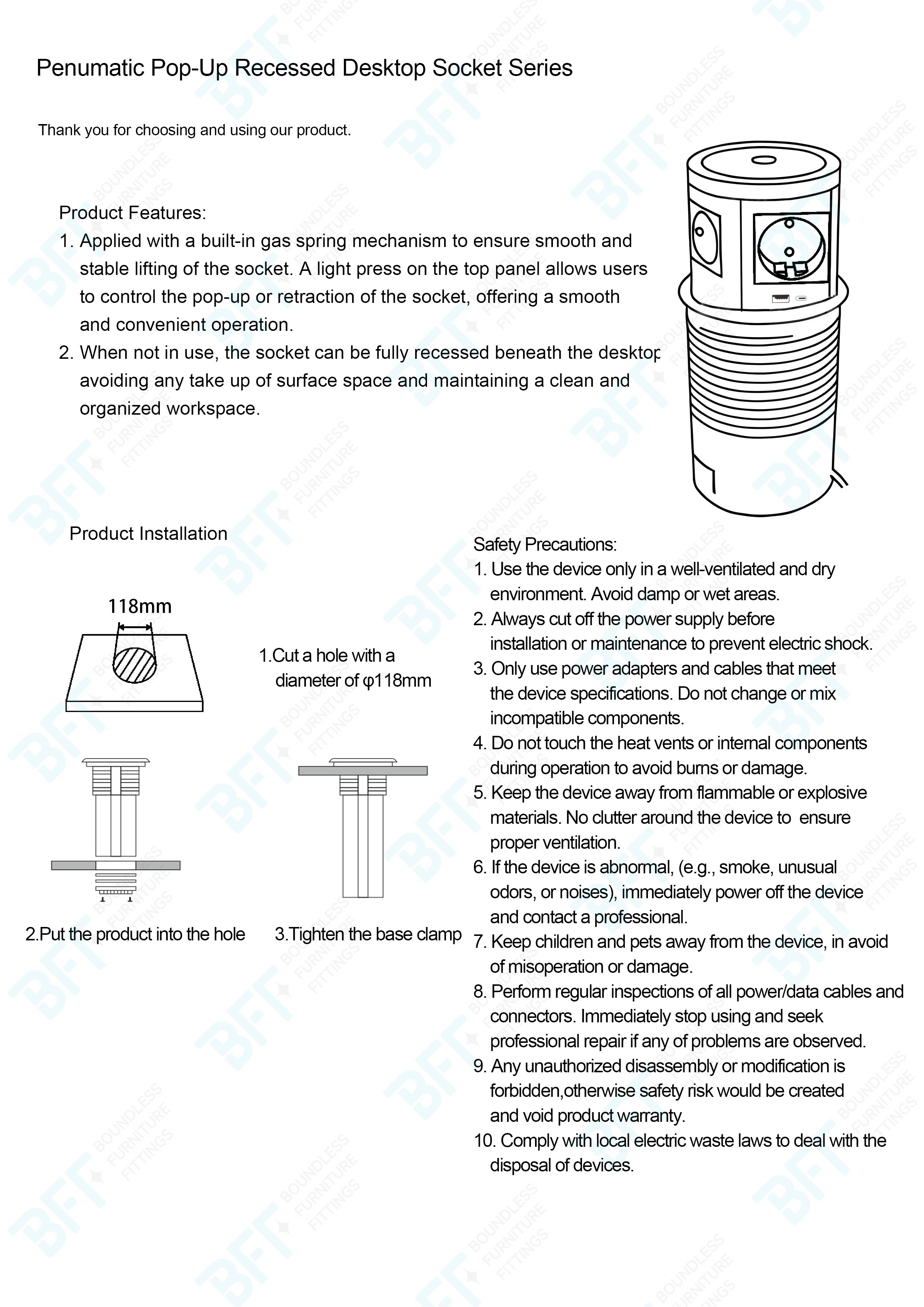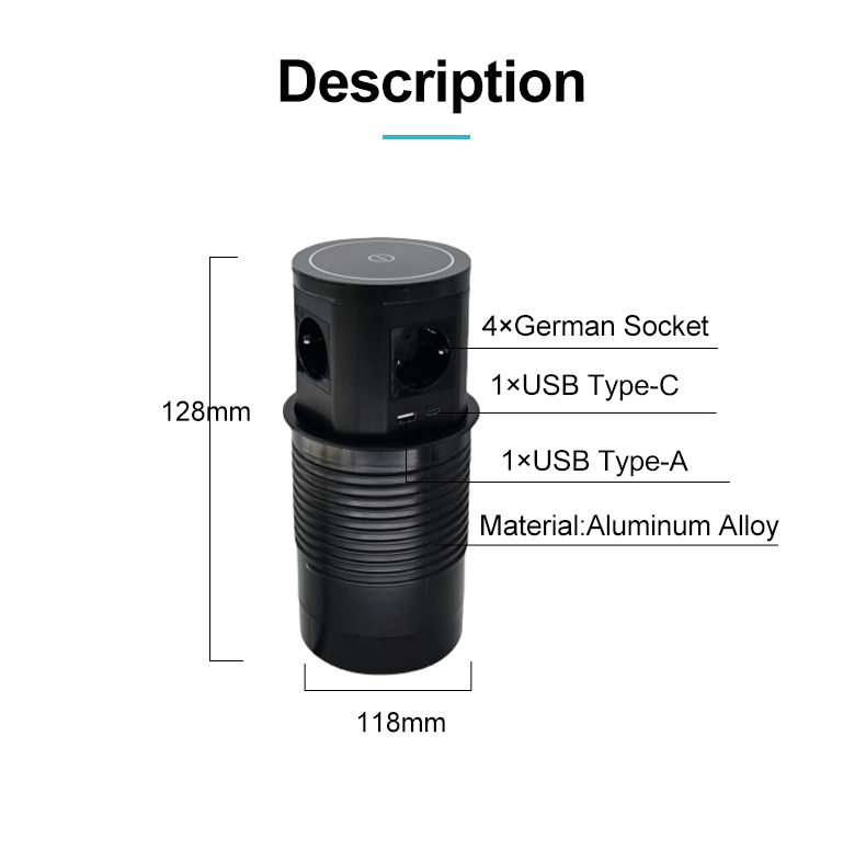 Press to lift hidden socket has been equipped with 5 functional sockets type: 4XGerman Socket+1USB Type A+1USB Type C(20W)+1Wireless Charger 15W in the retractable top housing provides access to electrical outlets, after the casing is pressed, the precise mechanism advances the panel with sockets automatically