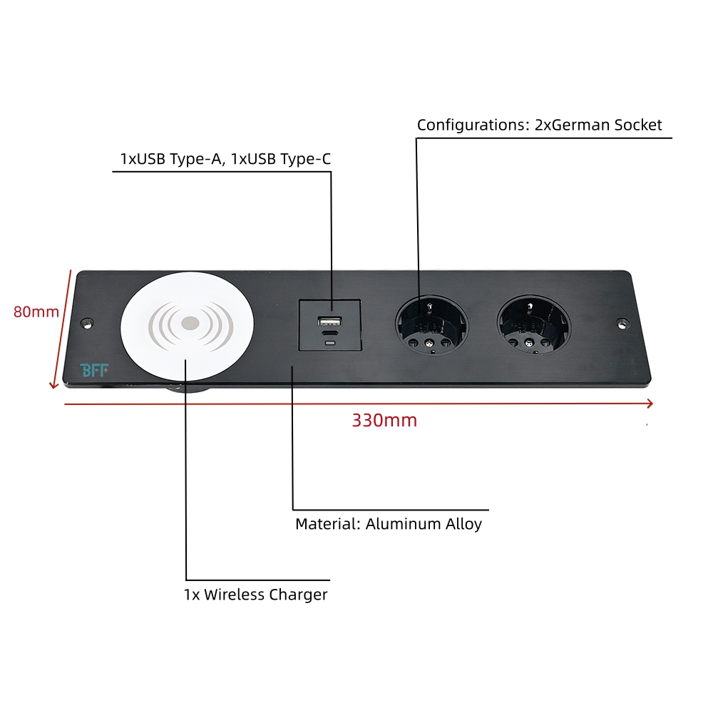 This socket is configured with 4 functional ports: 2XGerman socket+1USB Type A+1USB Type C+1Wireless Charger