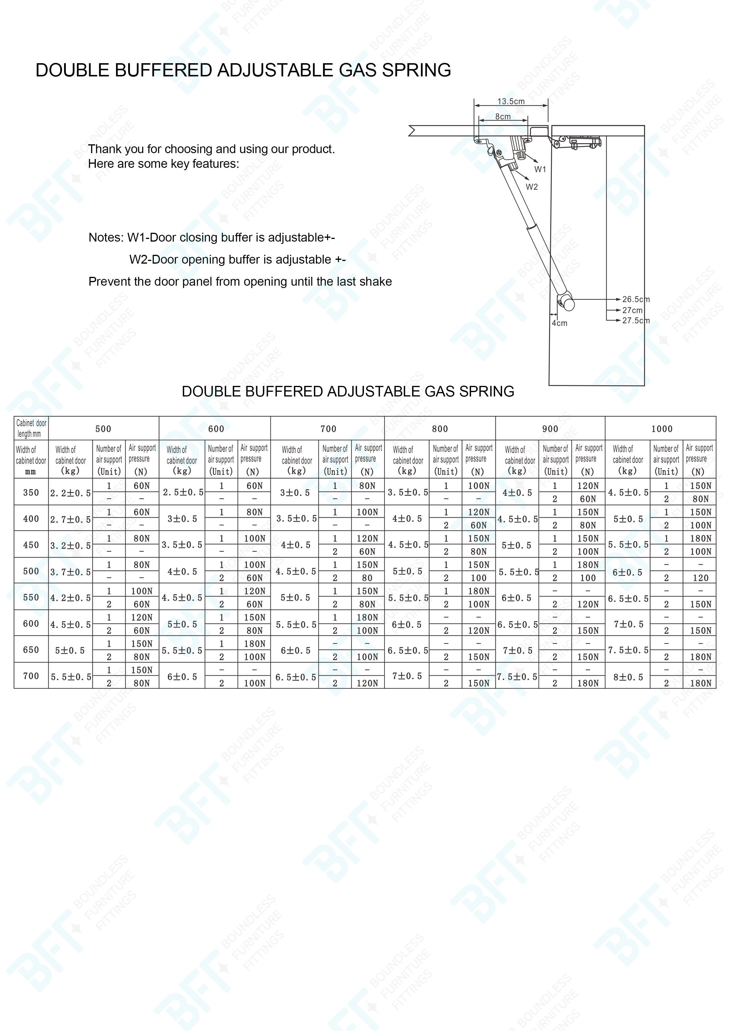 -Gas spring is a hydraulic/pneumatic device that is filled with high-pressure nitrogen gas inside, and achieves buffering, support of the cabinet door through the movement of the piston rod