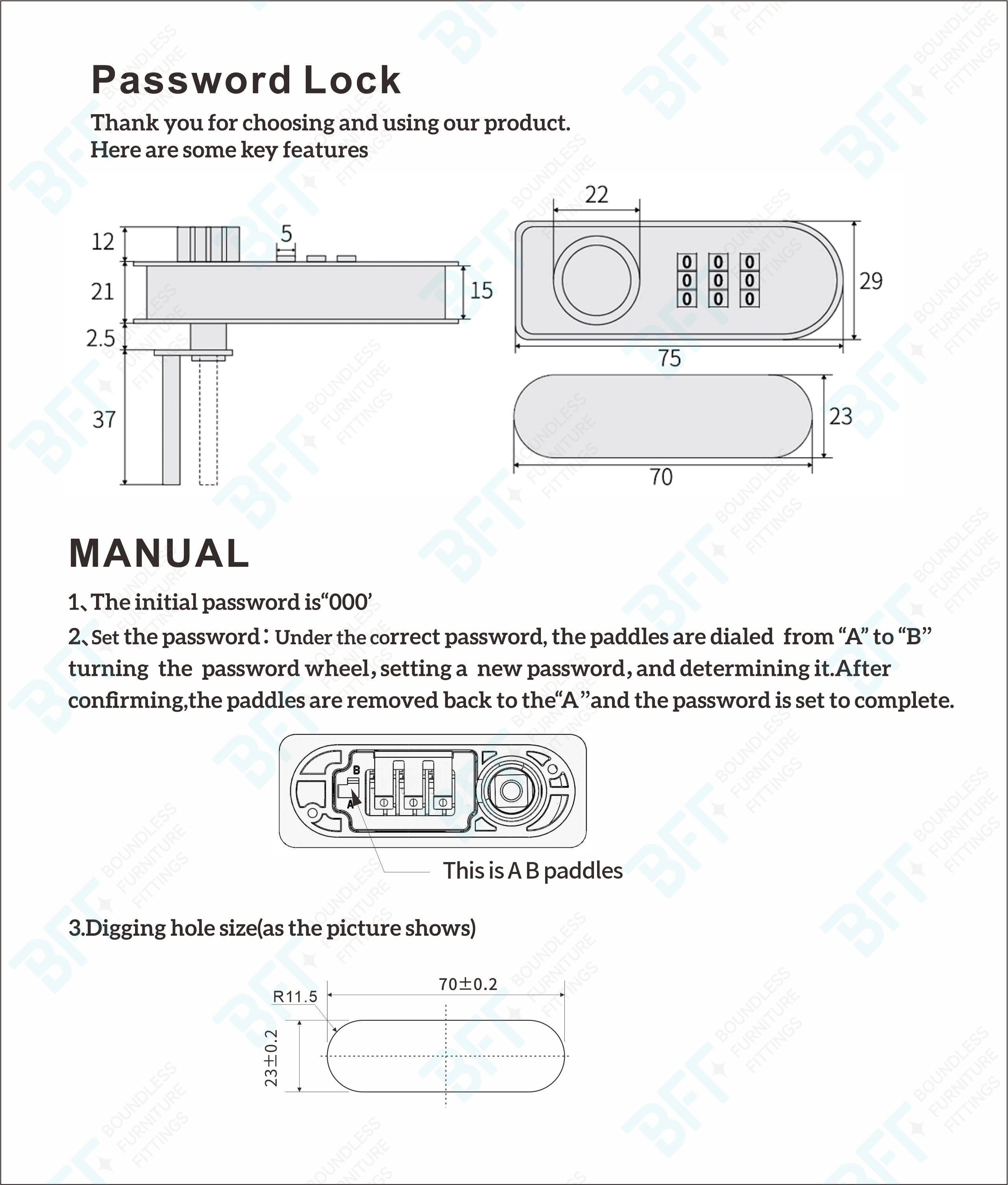 4.Dual ways access – Use password easy to open and close the lock,Emergency opening key is also provided to operate even if forgotten of the password codes that previously set.