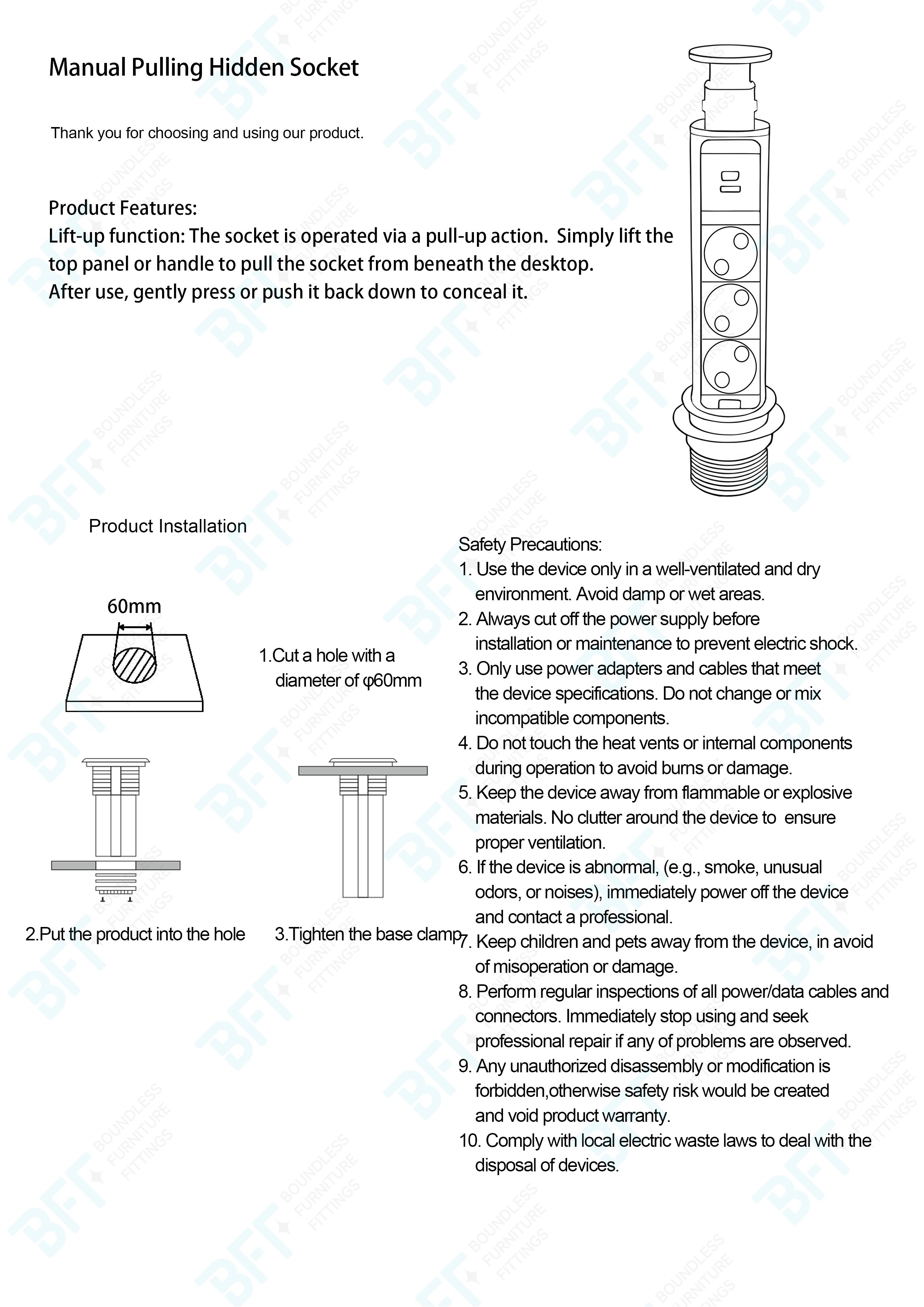 Manual pulling hidden socket has been equipped with 5 functional sockets type: 3XGerman Socket+1 USB Type A+ 1 USB Type C (5V2A)in the retractable top housing provides access to electrical outlets, after the casing is pressed, the precise mechanism advances the panel with sockets automatically