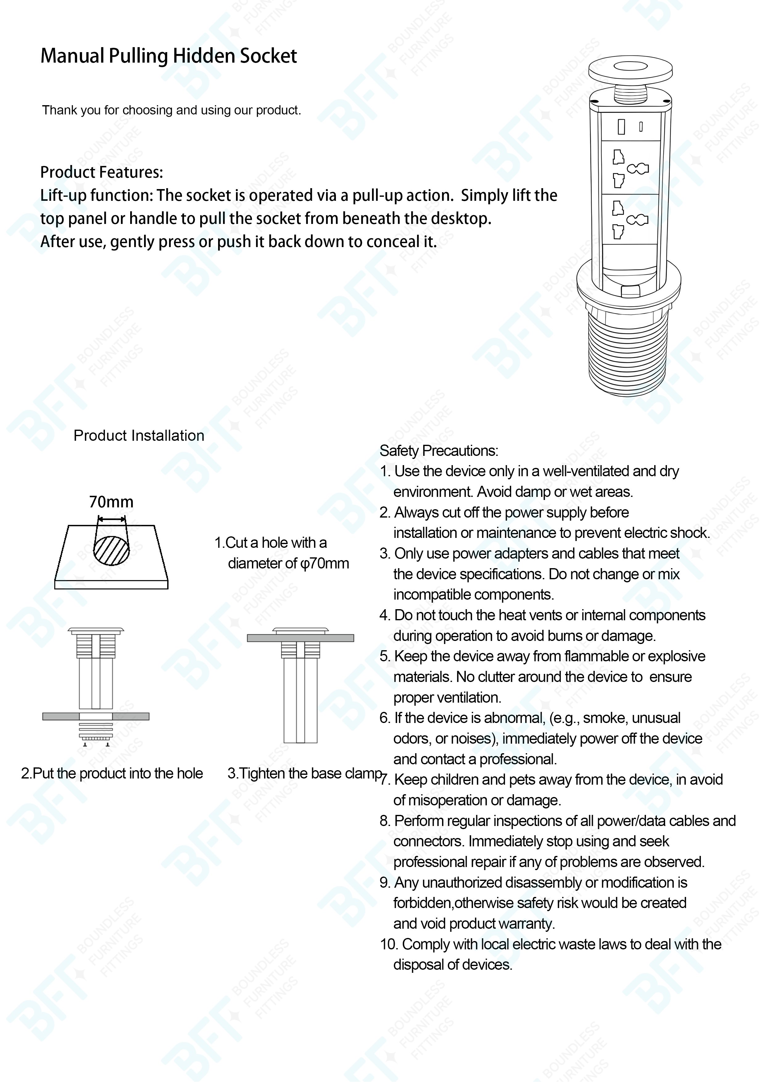 Manual pulling hidden socket has been equipped with 4 functional sockets type: 2XUK Socket+1 USB Type A+ 1 USB Type C (20W) +1Power switch in the retractable top housing provides access to electrical outlets, after the casing is pressed, the precise mechanism advances the panel with sockets automatically