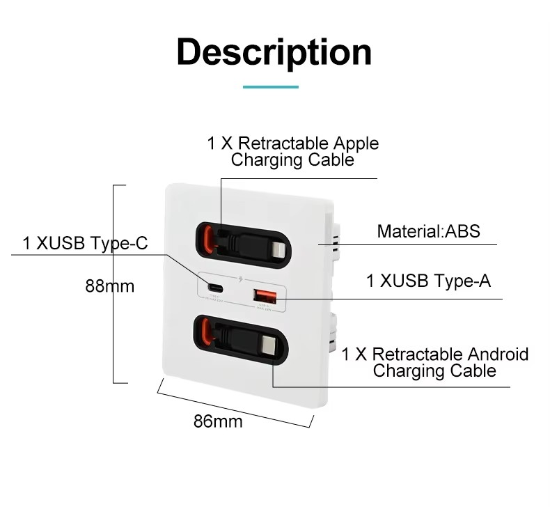 This socket is configured with 4 functional ports: 1XRetractable Android Charging Cable +1USB Type A+1USB Type C+2x2Pin power Socket