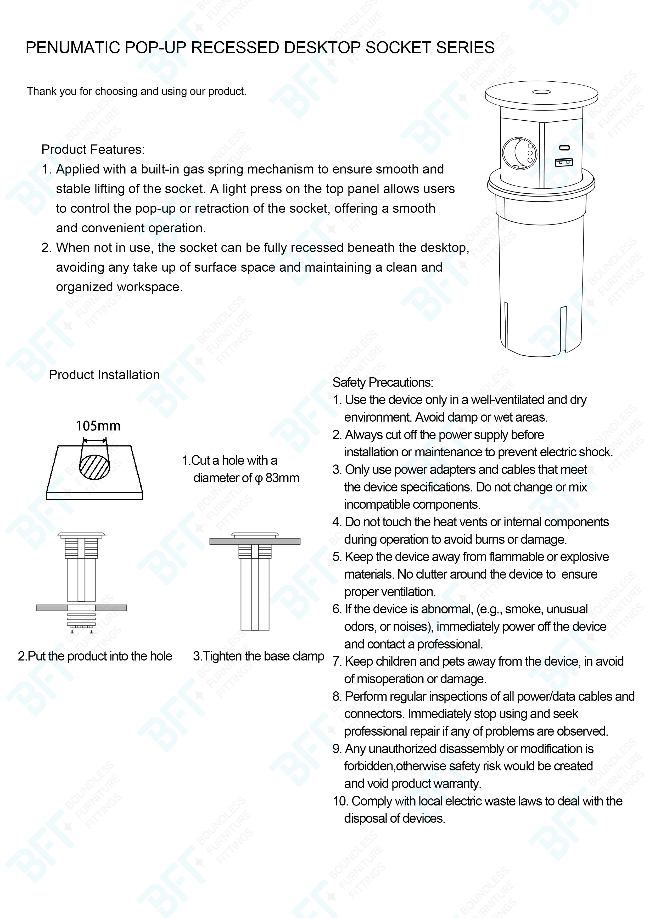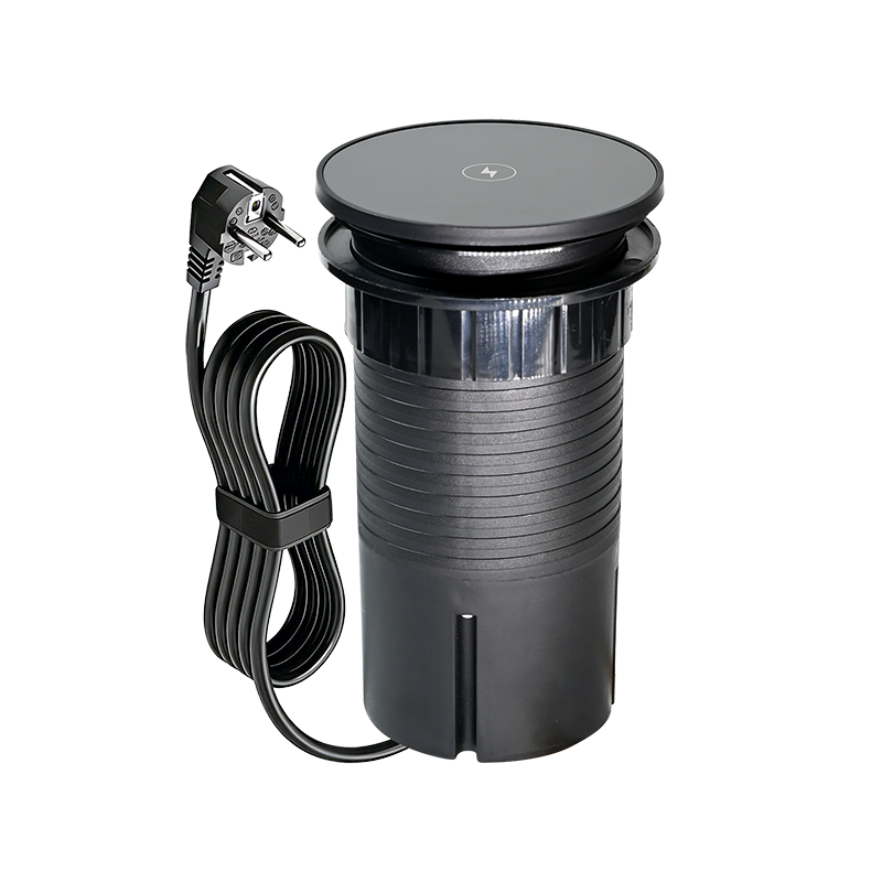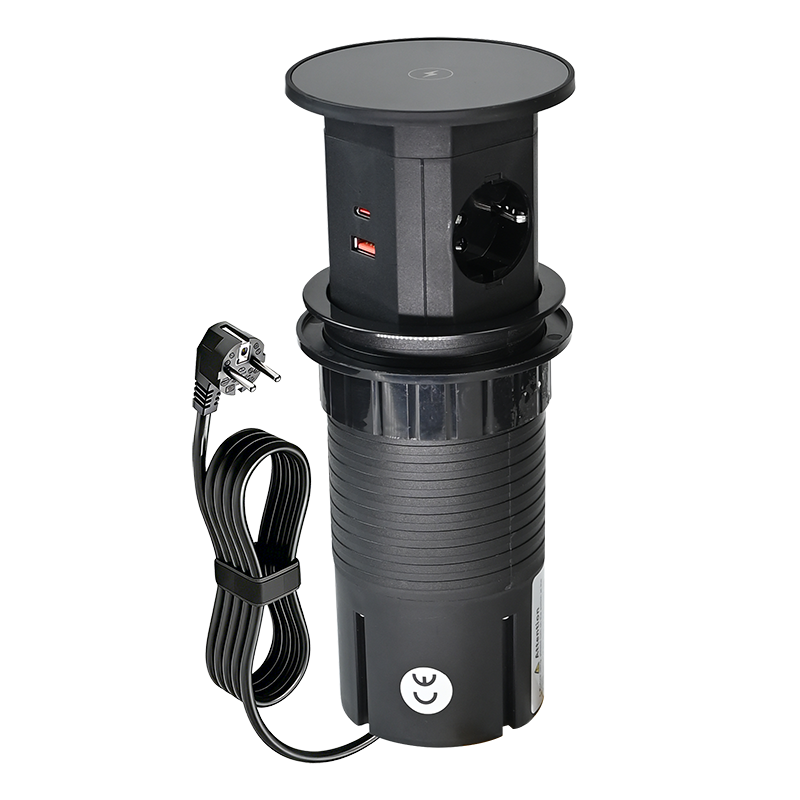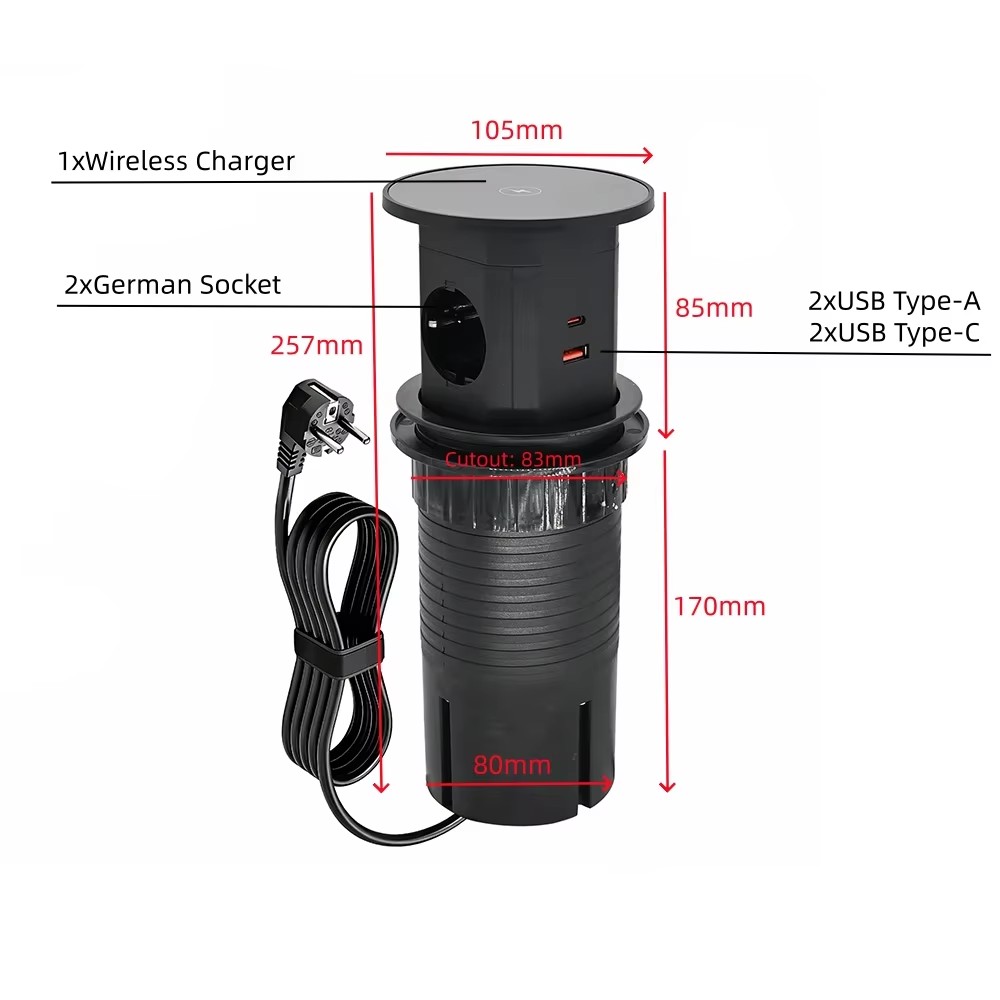 Pneumatic lifting hidden socket has been equipped with 4 functional sockets type:2XGerman Socket+2XUSB TypeA+2XUSB TypeC+1Wireless Charger, in the retractable top housing provides access to electrical outlets, after the casing is pressed, the precise mechanism advances the panel with sockets automatically